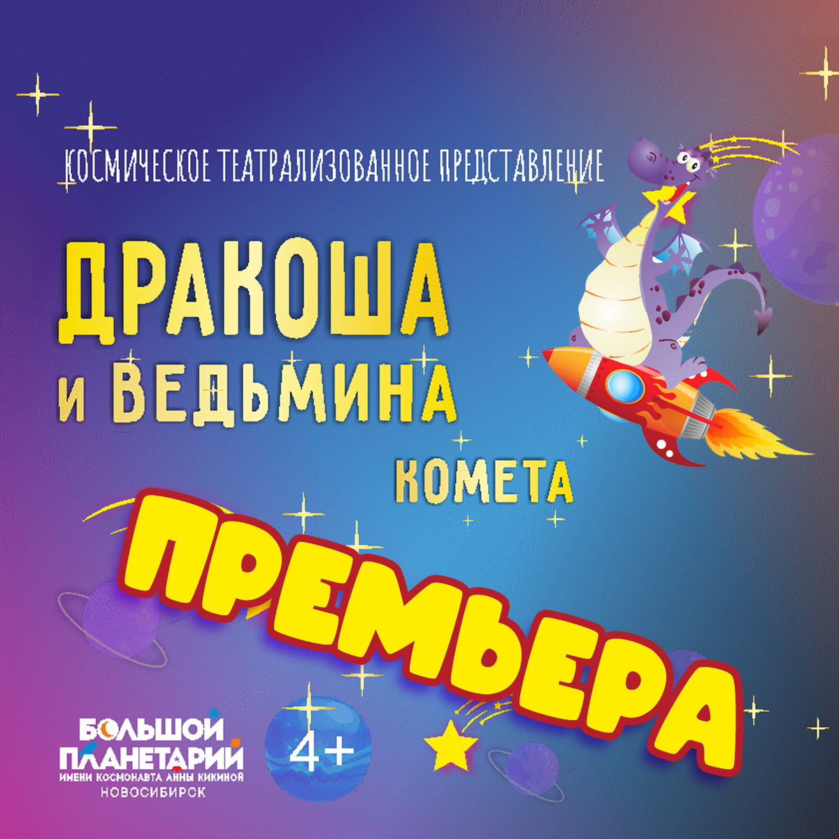 В рамках VII фестиваля "Отражение Вселенной" Большой новосибирский планетарий приготовил для юных зрителей особенный подарок – захватывающее театрализованное представление! Новая театрализованная сказка «Дракоша и ведьмина комета» — это увлекательное путешествие по звёздам и экзопланетам необычного дракона. Комета злой Ведьмы разрушает дом Дракоши и он отправляется в удивительное космическое приключение в поисках новой планеты. На своем пути герой встречает необычных друзей и открывает для себя чудеса разнообразных миров. Театрализованное представление в Звездном зале Ярославского планетария — это уникальная музыкальная иммерсивная сказка, которая погружает зрителей в удивительную магию космоса! С помощью купольной проекции невероятных космических пейзажей и сказочных объектов и присутствия "живых" персонажей юные зрители становятся настоящими участниками этой сказки. Вместе с героями ребята учатся ценить доброту, дружбу и понимать важность заботы о нашем мире. Отправляйтесь в захватывающее приключение, наполненное волшебством и музыкой в Планетарии!